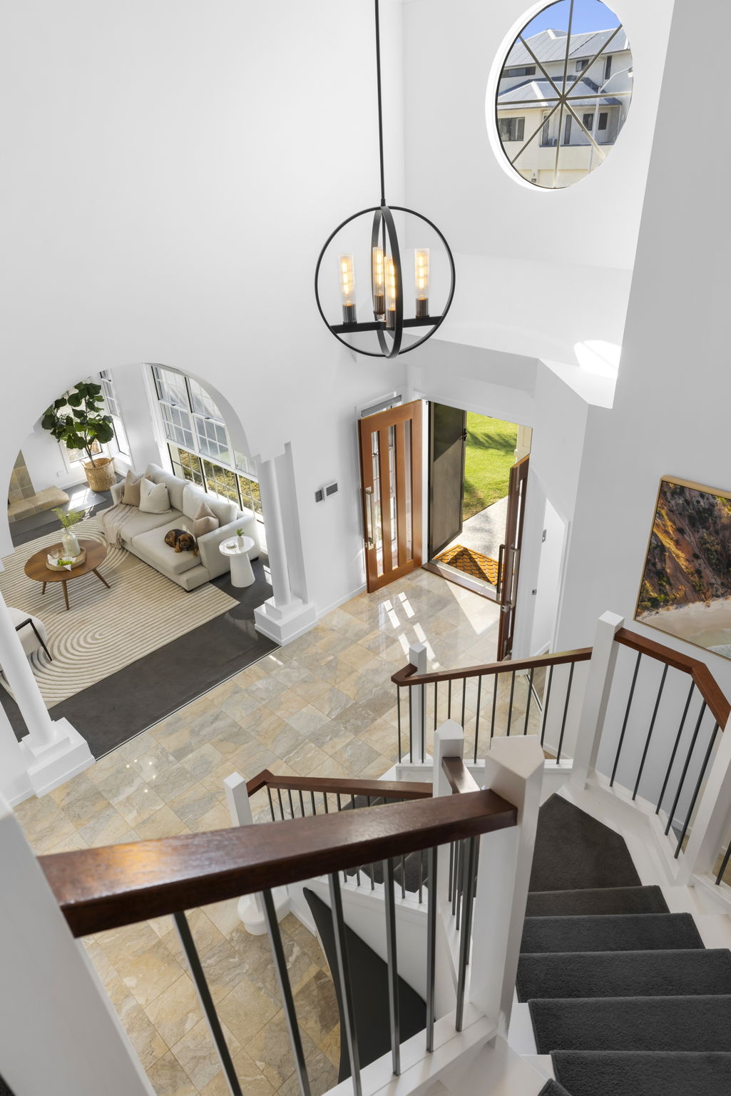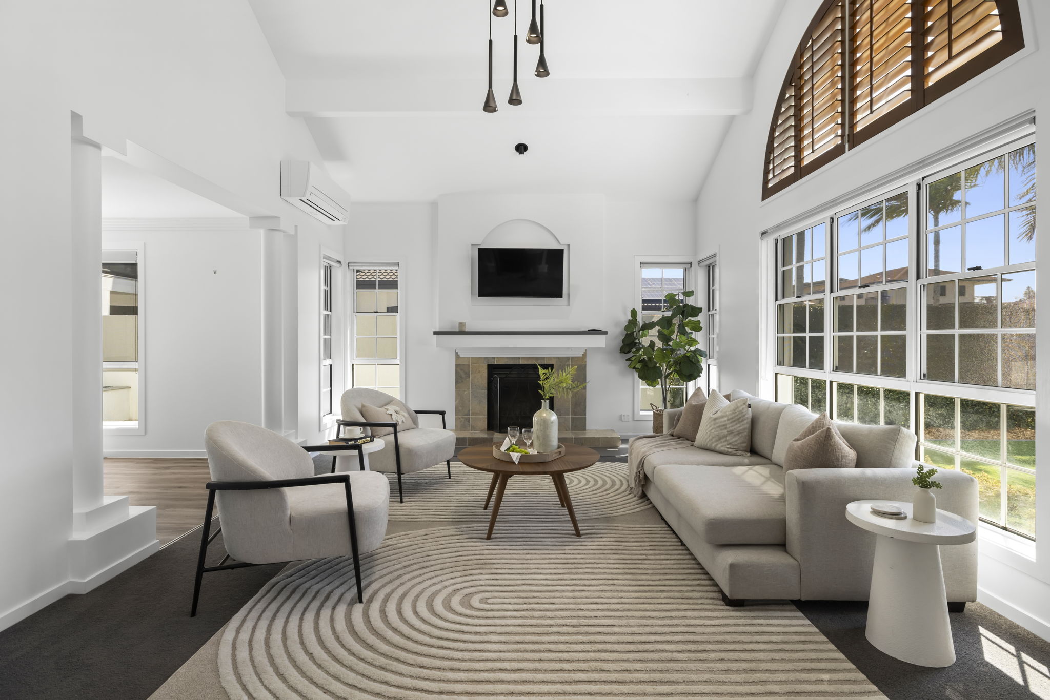A dramatic 6 metre void and soaring raked ceilings set the tone on arrival, creating a grand sense of space and elegance. The home’s facade and interiors reflect classic architectural elements including arched windows, symmetrical lines and light filled living zones, balanced beautifully with modern finishes and neutral tones. Marble titled flooring underfoot, high ceilings and expansive glazing enhance the airy coastal feel throughout. At the heart of the home, the gourmet kitchen features 40 mm stone benchtops, Bosch appliances including induction cooking, and an integrated Liebherr fridge, flowing seamlessly to multiple living and dining spaces anchored by a working fireplace.