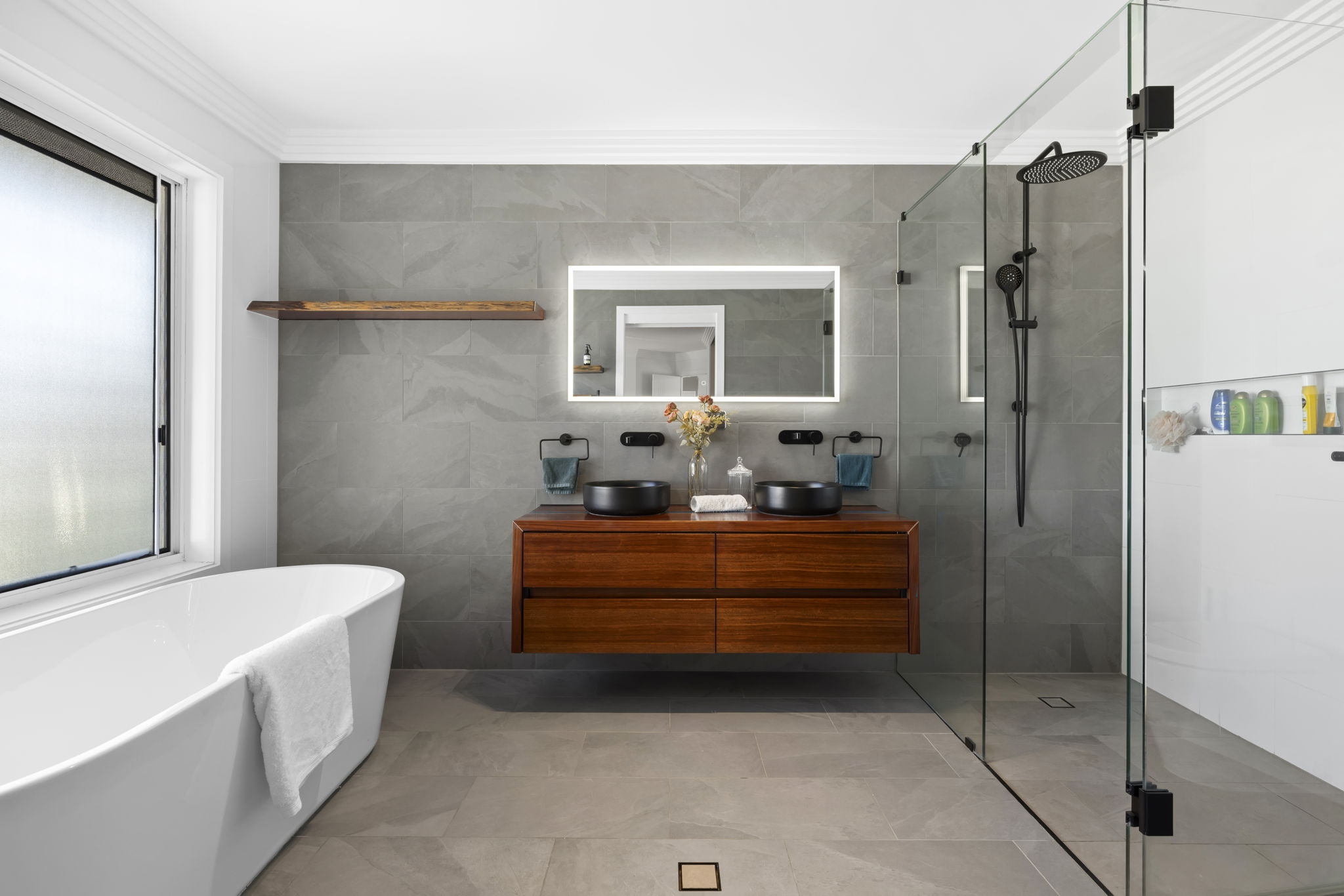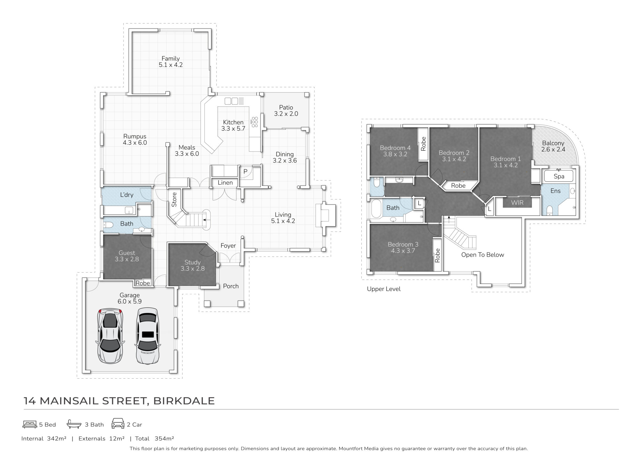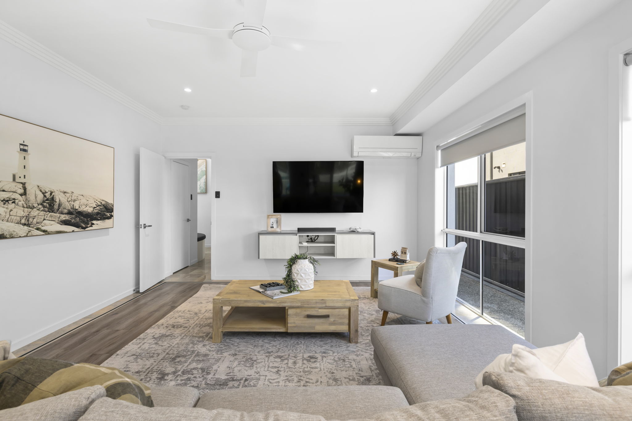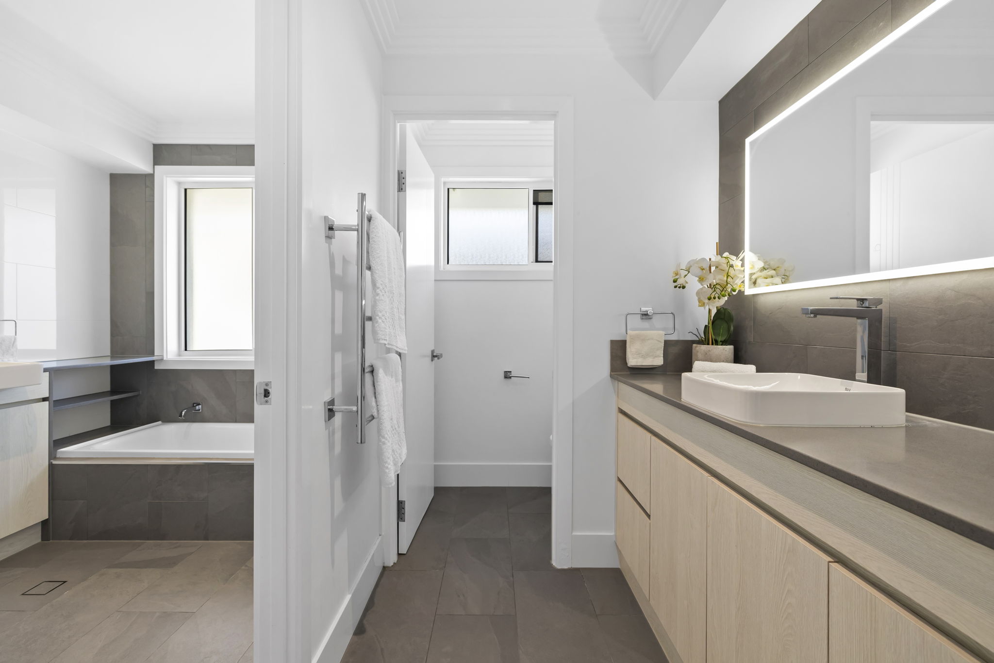 Designed for versatility, the floor plan offers five bedrooms plus a separate study. A ground floor guest bedroom with its own ensuite is ideal for guests or multi generational living, while the primary suite upstairs enjoys water views, a walk in robe, indulgent ensuite and a private balcony. The remaining three upstairs bedrooms are generously sized, each with built in robes, and share a well appointed family bathroom. All bedrooms are air conditioned for year round comfort and most rooms include ceiling fans.